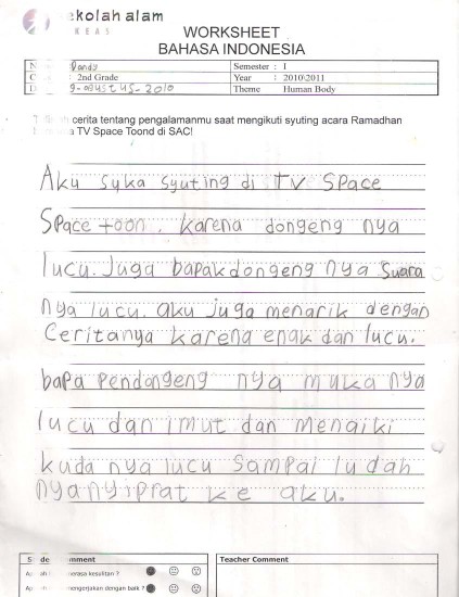 Jum’at siang ini Kegiatan Belajar Mengajar di Sekolah Alam Cikeas (SAC) terlihat sedikit berbeda. Hari ini kami kedatangan tamu dari PT. Televisi Anak Spacetoon yang akan menayangkan program “Asyiknya Ramadhan” yang akan ditayangkan selama bulan Ramadhan 1431 H selama 7 menit menjelang waktu berbuka puasa. Siswa-siswi SAC berkesempatan untuk mengisi rangkaian acara tersebut. Mereka sangat antusias mengikuti acara ini dengan mendengarkan dongeng yang sangat menarik dari Kak Awam. Ingin mendengar laporan menarik dari mereka? Yuk, kita simak cerita mereka..... “
